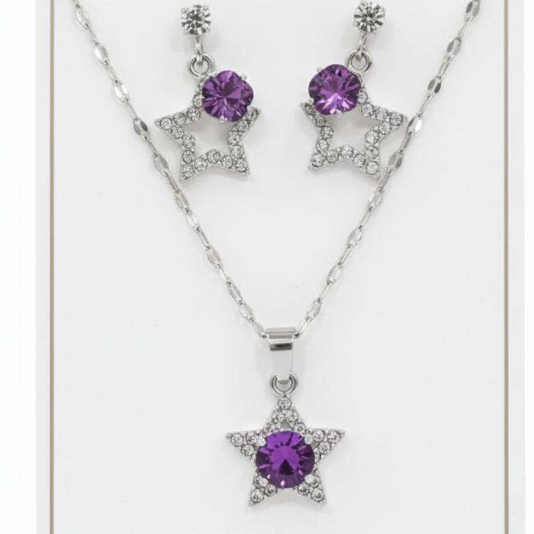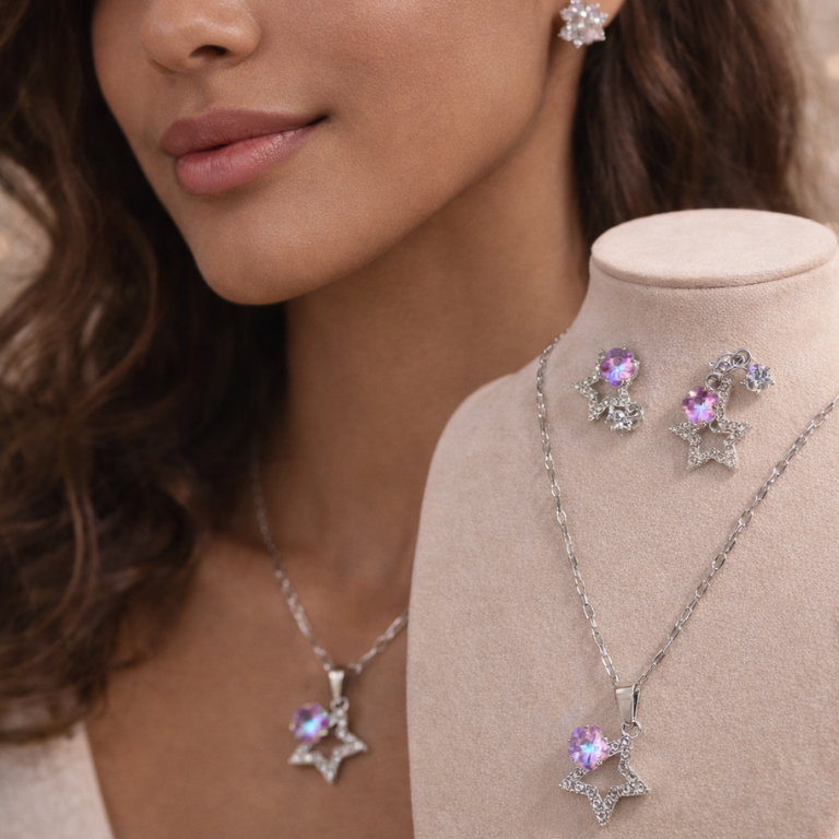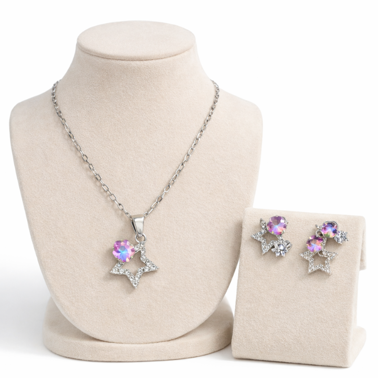 Elevate your elegance with the Celestial Star Crystal Jewelry Set, a graceful combination of sparkle and sophistication. Crafted in a polished silver-tone finish, this set features a delicate star-shaped pendant necklace paired with matching stud earrings, each adorned with radiant iridescent crystals that reflect soft hues of pink, violet, and blue.