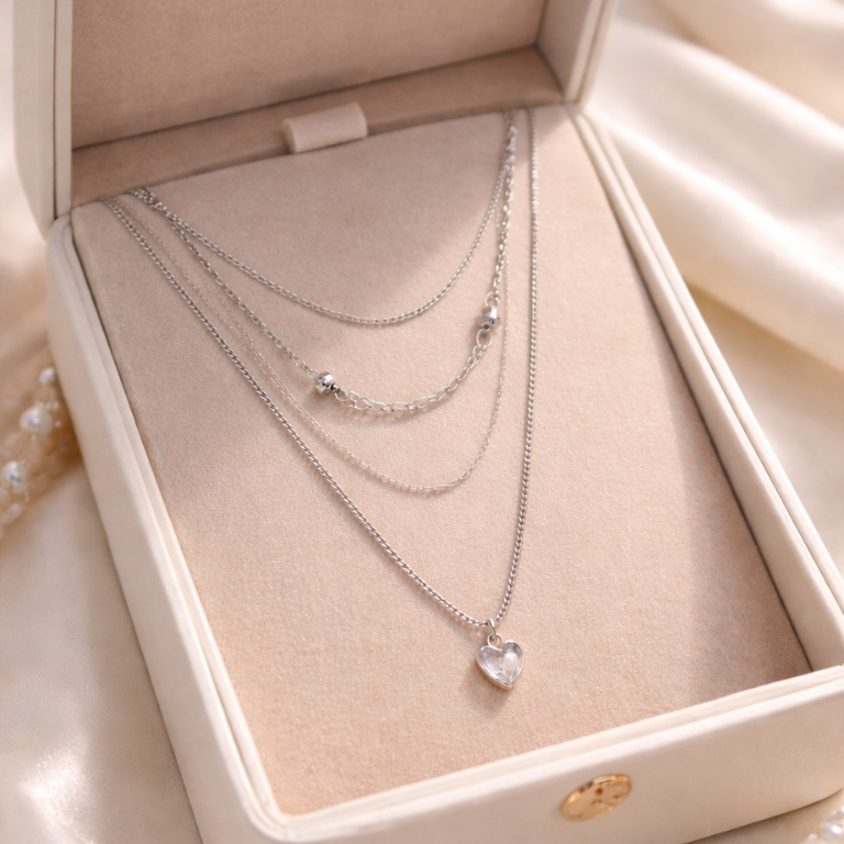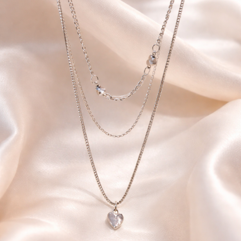 The centerpiece is a polished heart-shaped crystal pendant that reflects light with a soft, romantic sparkle. Accented with fine silver beads and refined chain detailing, this piece offers a perfect balance between simplicity and sophistication.