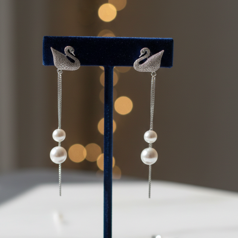 Pair these stunning drops with an up-do hairstyle to fully showcase the intricate swan detail and the elegant length of the pearls. They serve as a perfect standalone statement piece or can be matched with a simple silver pendant.