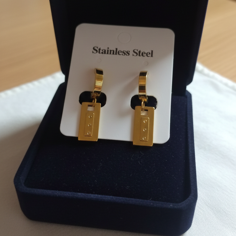 These stunning drop earrings feature a sleek, rectangular “tablet” design suspended from a polished gold-toned hoop. Crafted from high-quality stainless steel, they offer a luxurious gold finish that provides the look of solid gold with the durability and tarnish-resistance you need for daily wear.