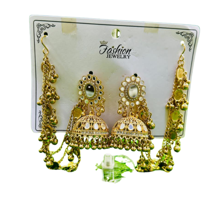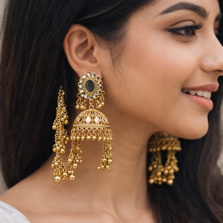These exquisite traditional jhumka earrings are crafted in a rich gold-tone finish, inspired by classic South Asian heritage jewelry. The top features an elegant circular design adorned with mirror-style stones, adding a subtle reflective charm. Below, the beautifully dome-shaped jhumka showcases intricate filigree work, enhanced with delicate pearl accents that catch the light with every movement. Long dangling chains with tiny gold beads add graceful length and a statement appeal.